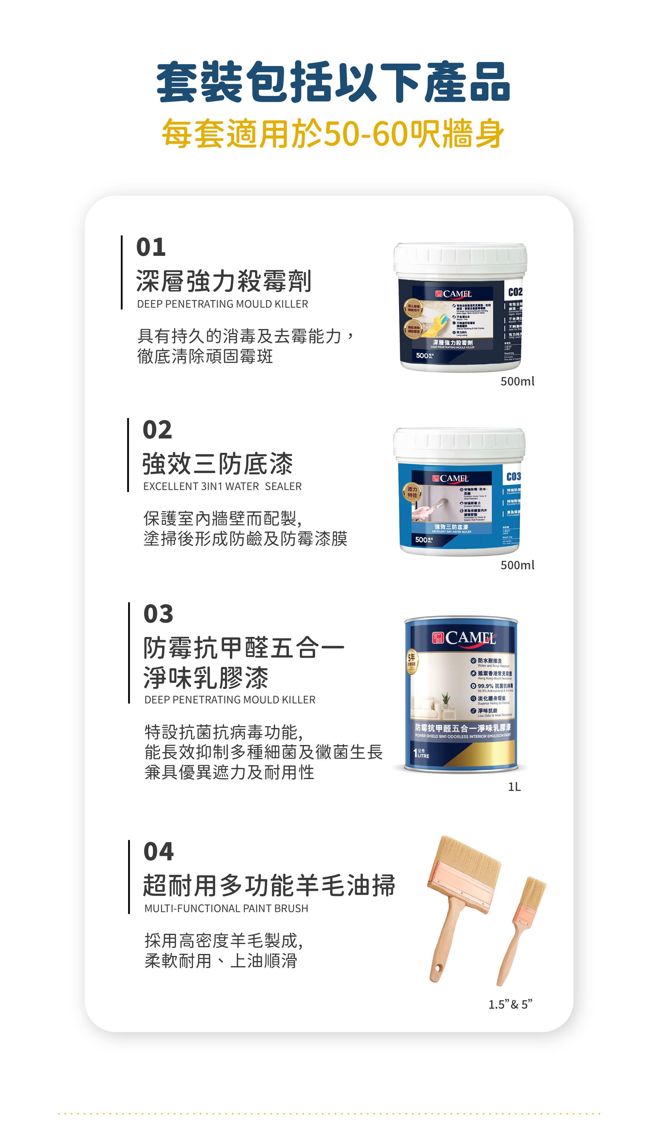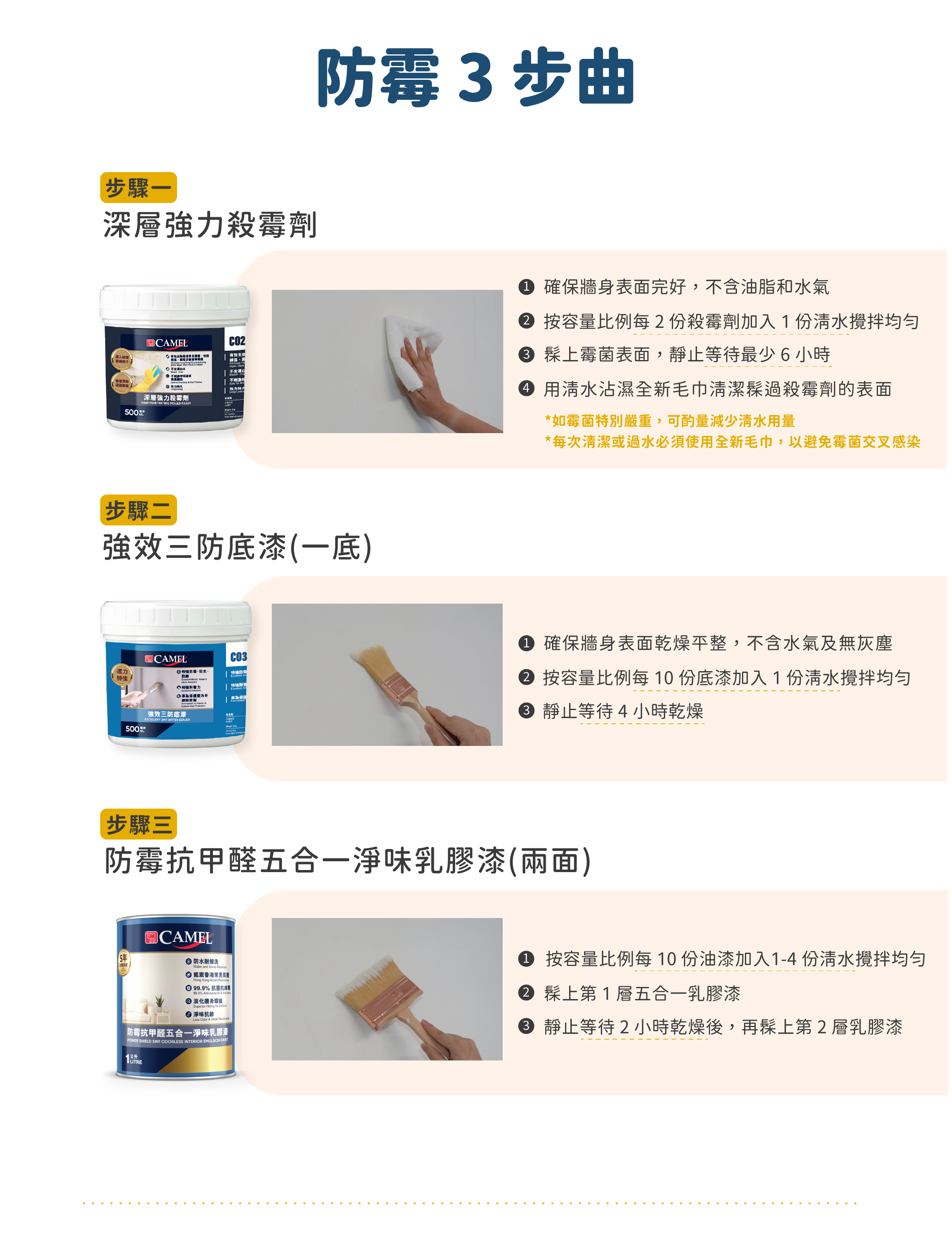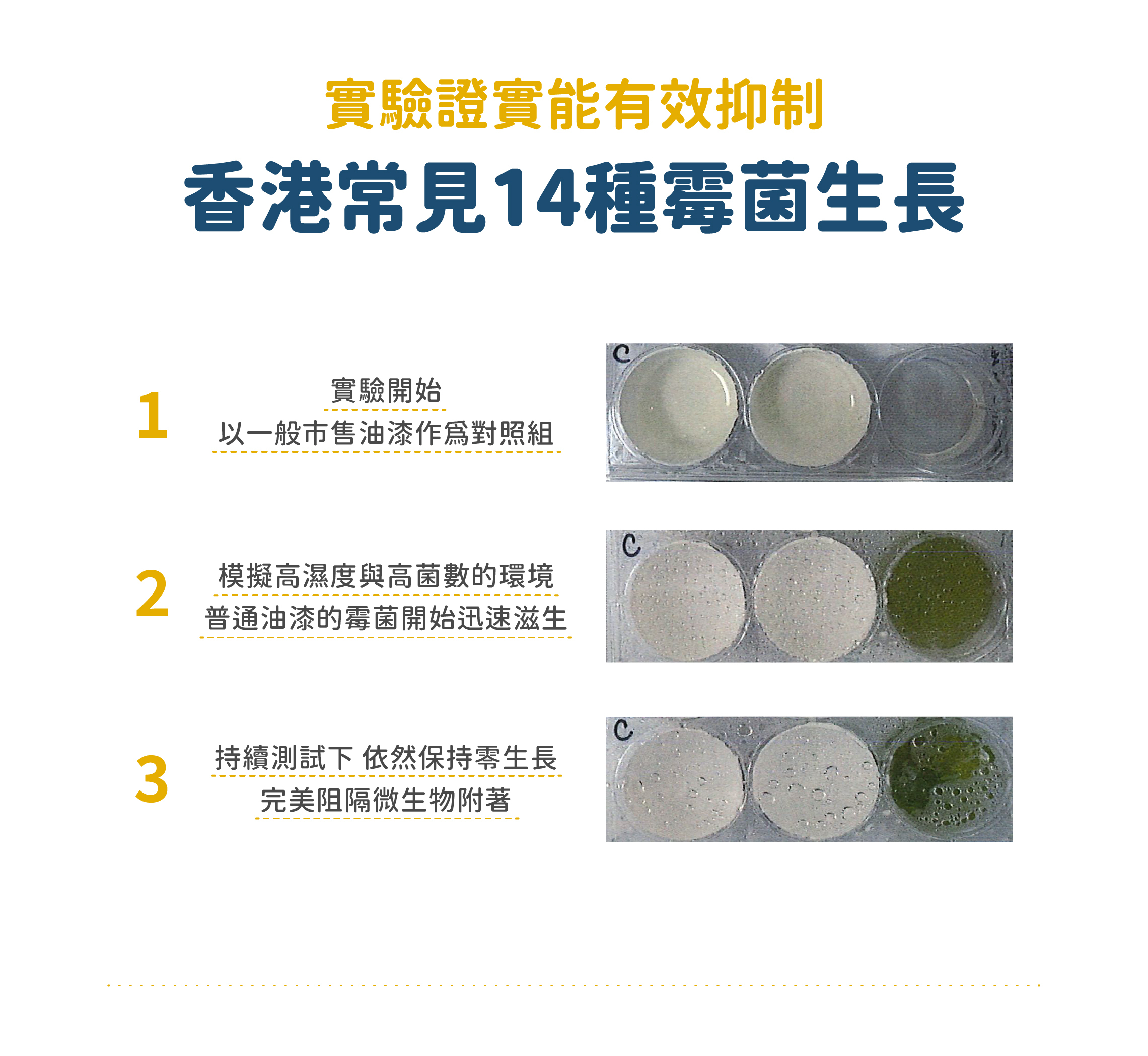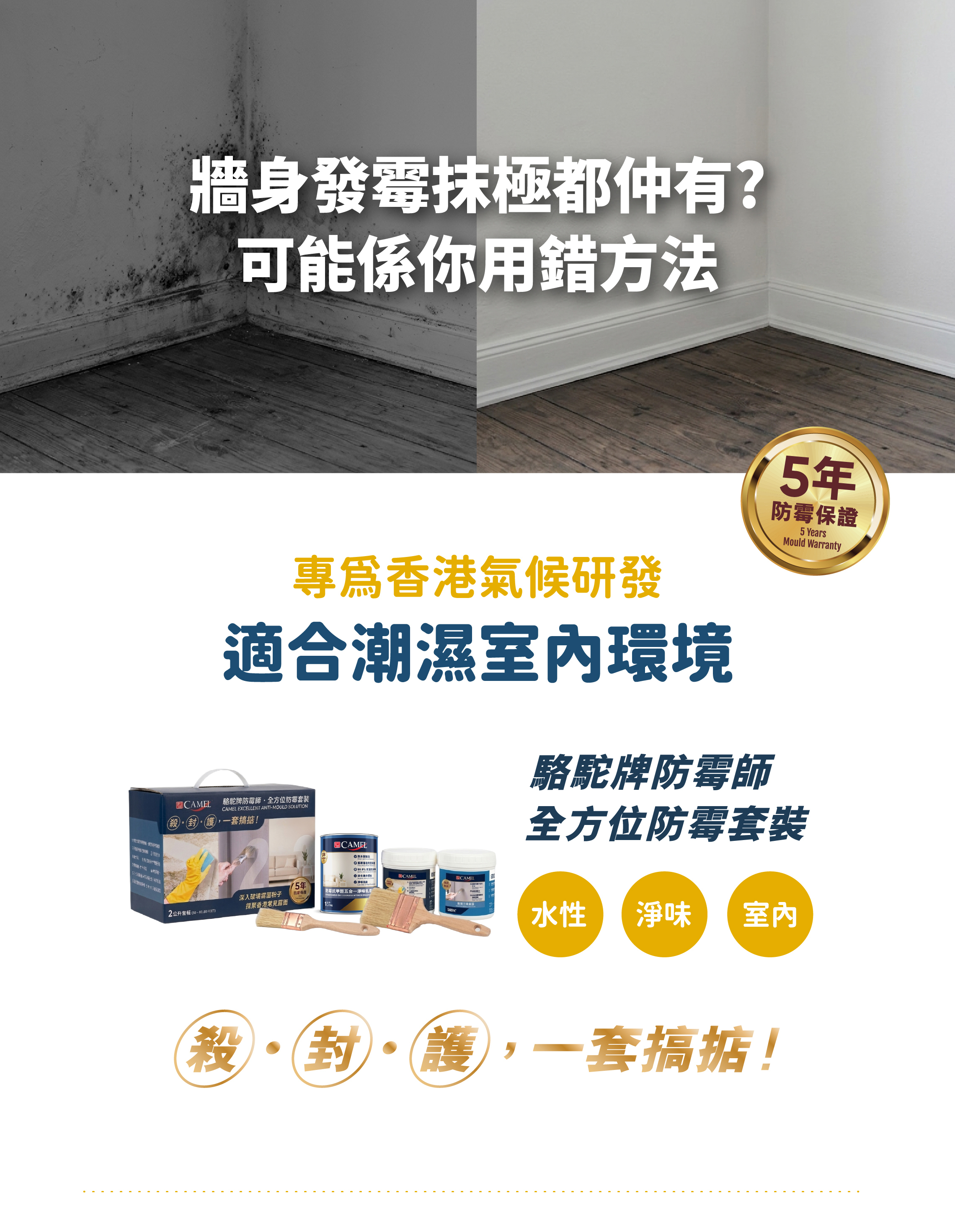 專為香港潮濕氣候研發的專業級家居修繕方案。本套裝打破傳統「只抹表面」的局限,採用系統化的「殺霉、底漆、面漆」三步曲,從根源解決牆身發霉煩惱。經本地第三方實驗室測試,證實能有效應對 14 種香港常見霉菌,在嚴苛的模擬環境挑戰下,漆膜表面的霉菌生長率始終保持為 0 ,達到完全零生長的卓越標準。